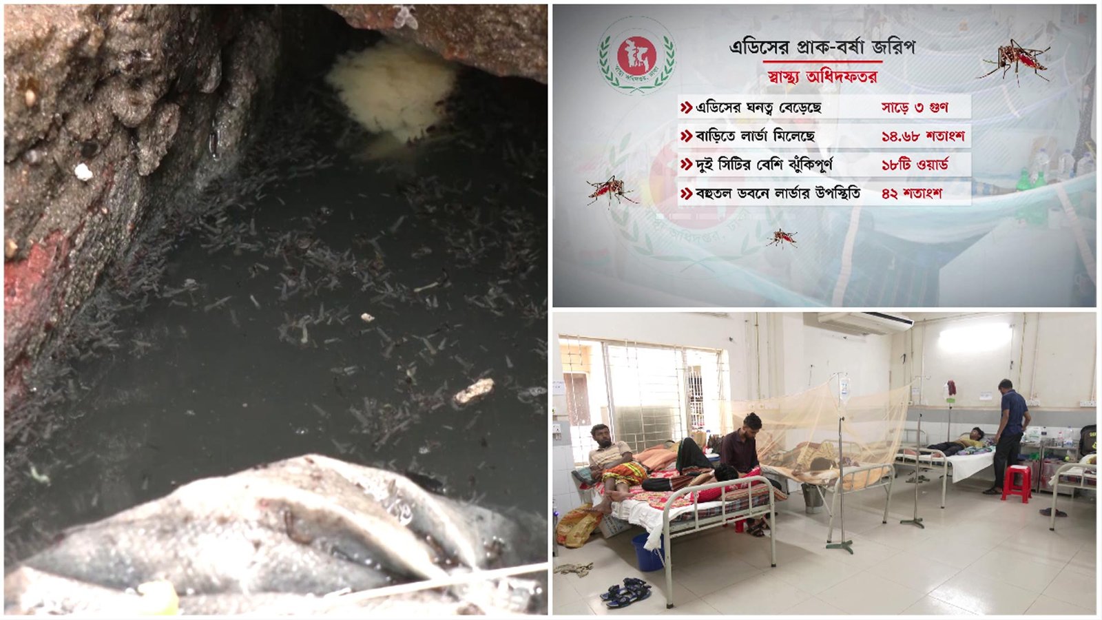 স্বাস্থ্য অধিদফতরের রোগ নিয়ন্ত্রণ শাখা পরিচালিত প্রাক বর্ষা এডিস সার্ভেতে উঠে এসেছে, ভয়াবহ চিত্র। যেখানে ১৪.৬৮ শতাংশ বাসাবাড়িতে মেলে এডিসের লার্ভা। গত বছর একই সময়ে এই হার ছিল ৪.০৩ শতাংশ। অর্থাৎ, গত বছরের তুলনায় বাসাবাড়িতে এডিসের ঘনত্ব বেড়েছে সাড়ে তিন গুণের বেশি।